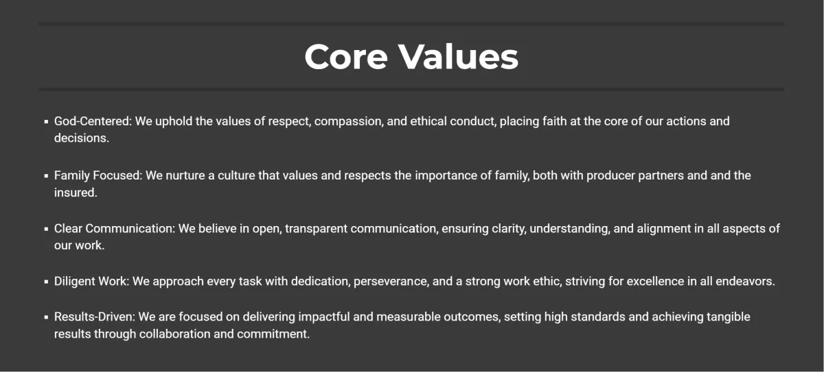 Together we pave the way for a secure tomorrow. Our core values form the foundation of everything we do. We are proudly God-Centered, Family-Focused, Results-Driven, Diligent Workers, and Clear Communicators. These values guide our actions, decisions, and relationships, reflecting our unwavering commitment to integrity and excellence. At the heart of our mission is the dedication to financially protect generations.